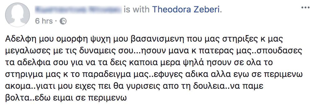 Σε άλλη ανάρτηση, η αδερφή της άτυχης εφοριακού ζητά βοήθεια απ’ όλους για να βρεθεί ο δολοφόνος της Δώρας, στέλνοντας παράλληλα ένα συγκινητικό μήνυμα στην αδερφή της: