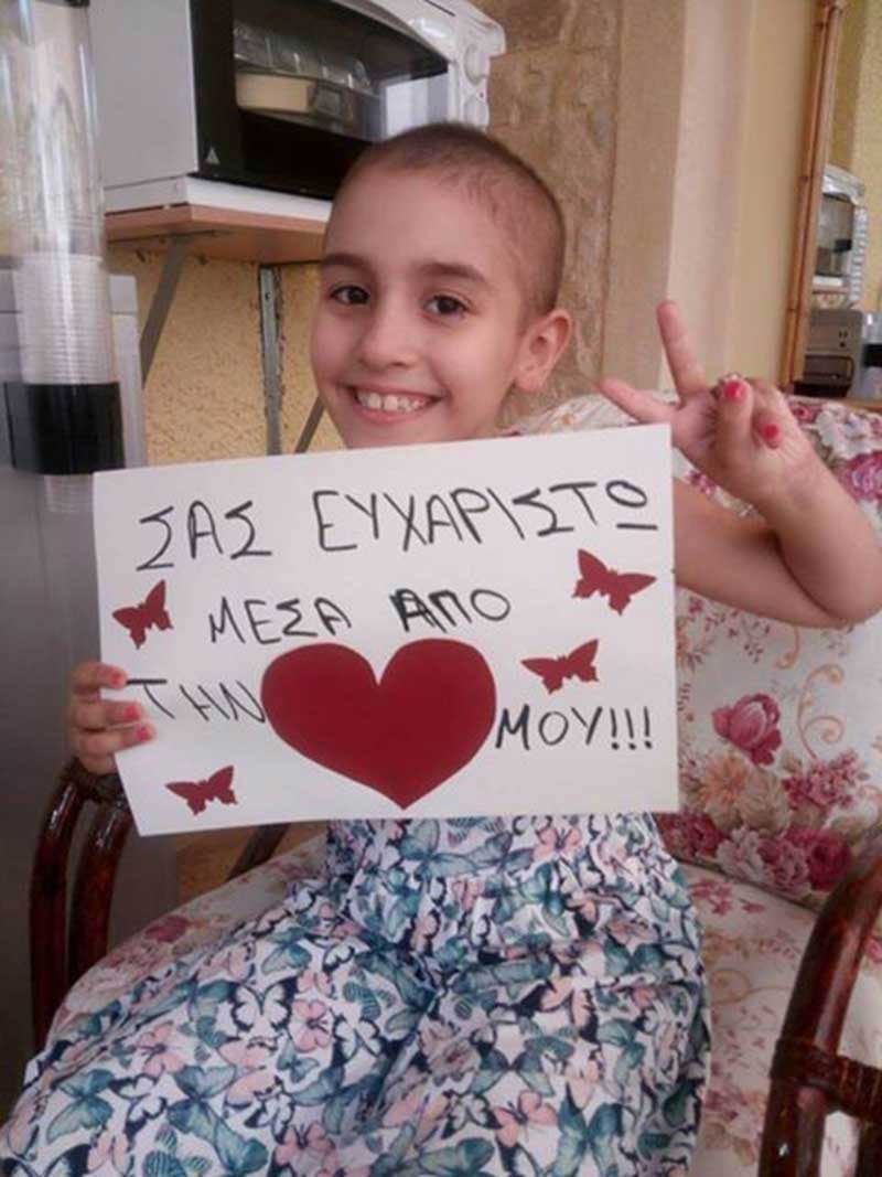 Με ένα τεράστιο χαμόγελο ελπίδας και ευγνωμοσύνης η οκτάχρονη Ευαγγελία Καστρινάκη, στέλνει τις ευχαριστίες της σε όλες και όλους που βοήθησαν στην προσπάθεια για να πάει εκεί που βρίσκεται από το απόγευμα της Δευτέρας.