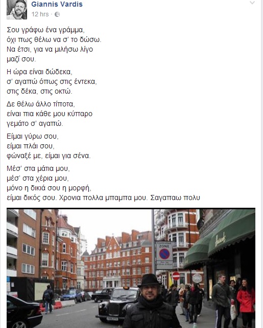 Μέσα από το προσωπικό του λογαριασμό στο facebook, ο γνωστός τραγουδιστής έστειλε τη δική του ευχή στον Αντώνη Βαρδή! Ο Γιάννης, δημοσίευσε με φωτογραφία του πατέρα του, την οποία συνόδευσε με τους στίχους του τραγουδιού «Ένα γράμμα».