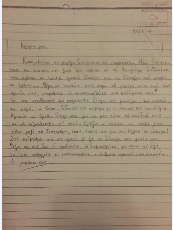 Η επιστολή φέρει ημερομηνία 22 Αυγούστου και περιλαμβάνεται στην ογκώδη δικοκογραφία για την απαγωγή του Μιχάλη Λεμπιδάκη. Αποδέκτες είναι τα παιδιά του επιχειρηματία που έζησε επί 6 μήνες τον εφιάλτη στα χέρια των απαγωγέων του.