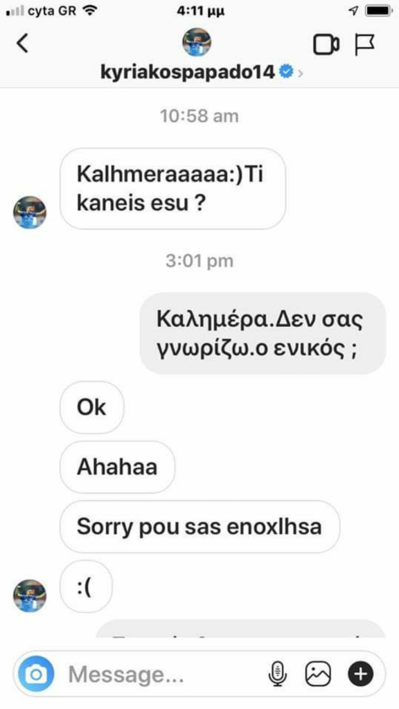 «Καλημέρα, τι κάνεις εσυ;» ήταν το μήνυμα του αμυντικού με εκείνη να απαντά κάπως επιθετικά «Καλημέρα. Δε σας γνωρίζω. Ο ενικός;».