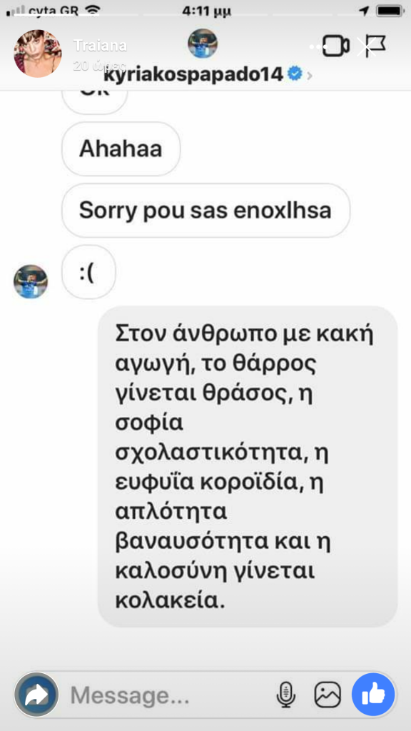 Τώρα η ηθοποιός έρχεται να ταράξει και πάλι λίγο τα νερά αφού αποφάσισε να δημοσιοποιήσει κάποια μηνύματα που έλαβε στον instagram από τον διεθνή ποδοσφαιριστή Κυριάκο Παπαδόπουλο. Ο ενικός που χρησιμοποίησε ο ποδοσφαιριστής φαίνεται να ενόχλησε ιδιαίτερα την Τραιάνα μιας και δε γνωρίζονται.