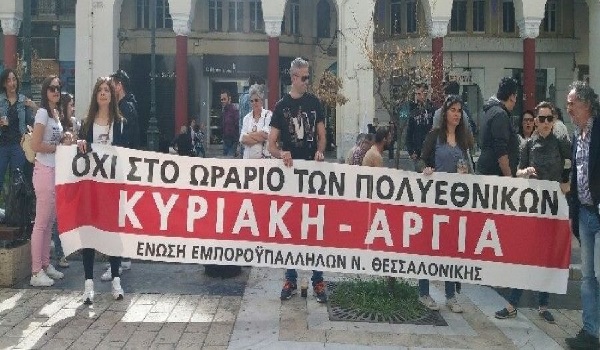 Μέλη της Ένωσης Εμποροϋπαλλήλων Ν. Θεσσαλονίκης θα συγκεντρωθούν στις10.00 στη στοά Χιρς για να πραγματοποιήσουν διαμαρτυρία υπέρ της Κυριακάτικης αργίας, ενώ την ίδια ώρα, ο Συντονισμός δράσεων ενάντια στην Κυριακάτικη εργασία δίνει ραντεβού στη συμβολή των οδών Τσιμισκή με Αριστοτέλους.