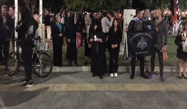 Οι διαδηλωτές αποτελούνται από παλαιοημερολογίτες και μέλη της εθνικιστικής οργάνωσης “Ιερός λόχος”.