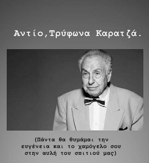 «Αντίο Τρύφωνα Καρατζά. Πάντα θα θυμάμαι την ευγένεια και το χαμόγελό σου στην αυλή του σπιτιού μας», σημείωσε στα social media η ηθοποιός.