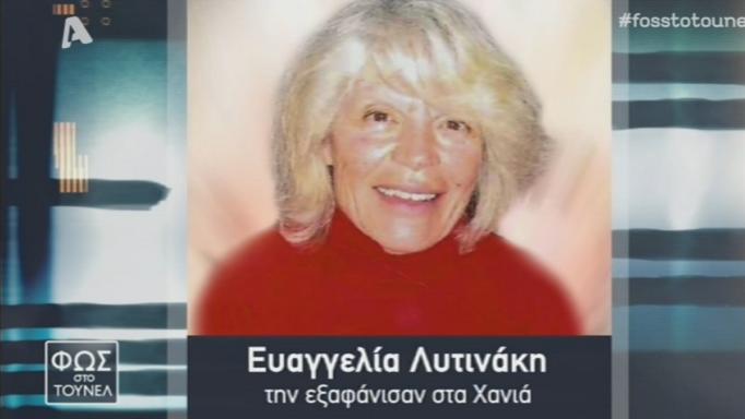 Τα ίχνη της δυναμικής και εύπορης Κρητικιάς Ευαγγελίας Λυτινάκη, χάθηκαν ξαφνικά το απόγευμα της Κυριακής 9 Δεκεμβρίου 2018, από την Αγία Μαρίνα Χανίων όπου μένουν τα τρία αδέλφια της… Η προσεκτική ανάλυση από το «Τούνελ», έδειξε τη λεπτομέρεια που μετέτρεψε την «απλή» εξαφάνιση, σ’ ένα απίστευτο θρίλερ… Τα όσα αποκάλυψε η εκπομπή, σόκαραν…