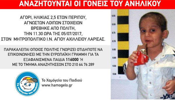 Μέσω της Ελληνικής Αστυνομίας δόθηκαν στη δημοσιότητα, χθες 17 Αυγούστου, στο πλαίσιο σχετικής Διάταξης της Εισαγγελίας Πρωτοδικών Λάρισας, φωτογραφίες του ανήλικου αγοριού, ηλικίας δυόμιση ετών περίπου, (αγνώστων λοιπών στοιχείων), που βρέθηκε από πολίτη, σε καλή κατάσταση υγείας, να περιπλανάται μόνο του χωρίς επίβλεψη και εκτεθειμένο σε άμεσο κίνδυνο, στις 05 Ιουλίου 2017, στον περιβάλλοντα χώρο του Μητροπολιτικού Ιερού Ναού Αγίου Αχιλλείου Λάρισας.