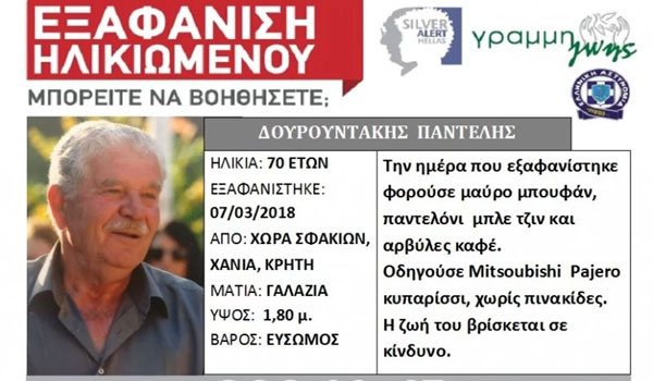 “Υπάρχει εξαφάνιση ηλικιωμένου από την περιοχή της Χώρας Σφακίων, στα Χανιά, Κρήτης. Εάν γνωρίζετε κάτι επικοινωνήστε με τη ΓΡΑΜΜΗ ΖΩΗΣ, όλο το 24ωρο, στην Εθνική Γραμμή SOS 1065.