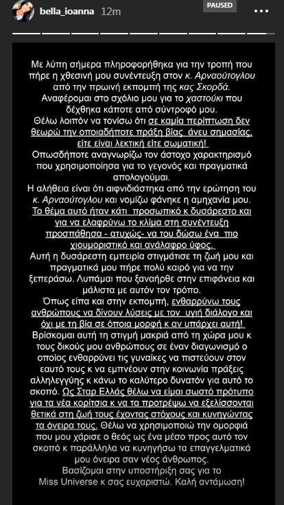 Μετά από όλο αυτό τον χαμό που δημιουργήθηκε, η Ιωάννα η οποία βρίσκεται στην Ταϊλάνδη για τις ανάγκες του διαγωνισμού ομορφιάς Miss Universe αποφάσισε να βάλει τα πράγματα στη θέση τους με μια μακροσκελή απάντηση στο instagram.