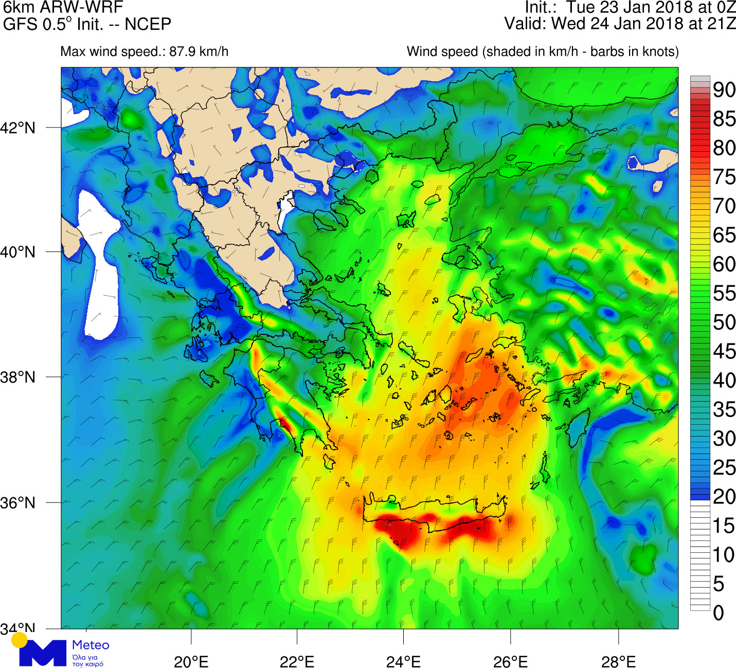 Χάρτης 2. Πρόγνωση ταχύτητας ανέμου σε ύψος 10μ για το βράδυ της Τετάρτης 24/01 σε km/h (χρώματα) και σε κόμβους (wind barbs).