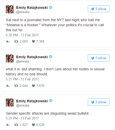«Κάθισα δίπλα σε έναν δημοσιογράφο των New York Times χθες το βράδυ, ο οποίος μου είπε «η Μελάνια είναι μια πόρνη». Όποια κι αν είναι η πολιτική στου τοποθέτηση είναι σημαντικό να το αναγνωρίσουμε αυτό ως αυτό που είναι: slut shaming (σ.σ. το στίγμα σε γυναίκες με έντονη σεξουαλικότητα): δεν με ενδιαφέρουν οι γυμνές φωτογραφίσεις της ούτε η σεξουαλική της ιστορία και κανέναν δεν θα έπρεπε να ενδιαφέρουν. Οι επιθέσεις με βάση το φύλο είναι αηδιαστικές, σεξιστικές μαλ@@@@ς», έγραψε η 25χρονη.