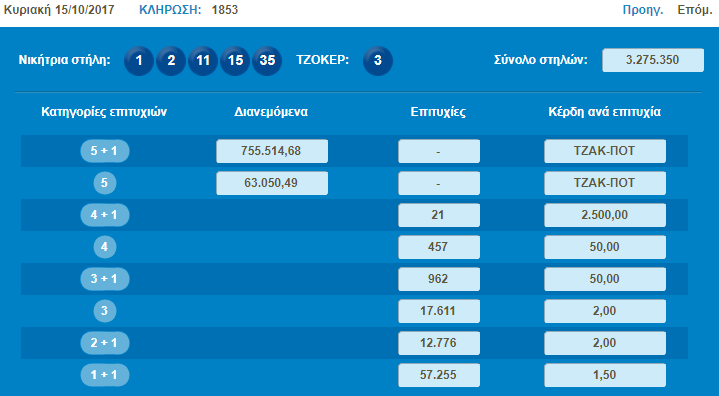 Η κλήρωση Τζόκερ Κυριακής 15/10/2017, μοιράζει τουλάχιστον 700.000 στους τυχερούς της πρώτης κατηγορίας.