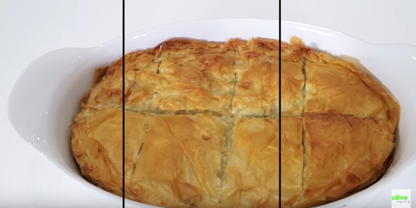 Τέλος χαράζετε την πίτα σε κομμάτια, την ραντίζετε με λίγο νερό και την ψήνετε για 50 λεπτά περίπου, μέχρι να ροδοκοκκινίσει πολύ καλά.