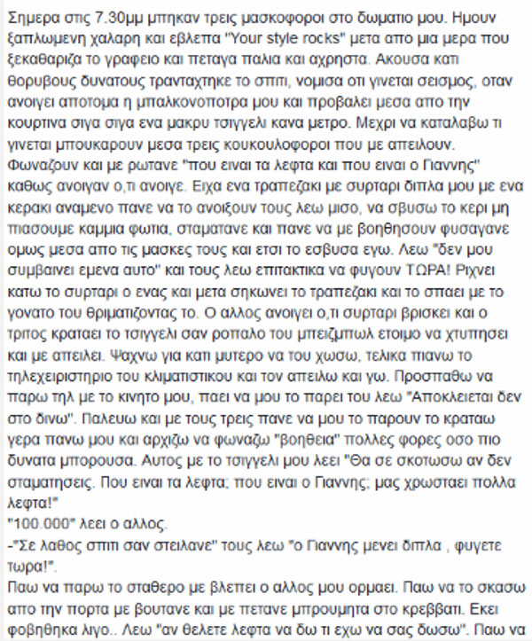 «Νόμισα ότι γίνεται σεισμός» λέει η ίδια περιγράφοντας στη σελίδα της στο facebook τις εφιαλτικές στιγμές που επακολούθησαν. «Ανοίγει απότομα η μπαλκονόπορτα και το πρώτο πράγμα που προβάλει είναι ένας σιδερένιος λοστός. Μέχρι να καταλάβω τι γίνεται, μπουκάρουν μέσα τρεις κουκουλοφόροι που με απειλούν!».