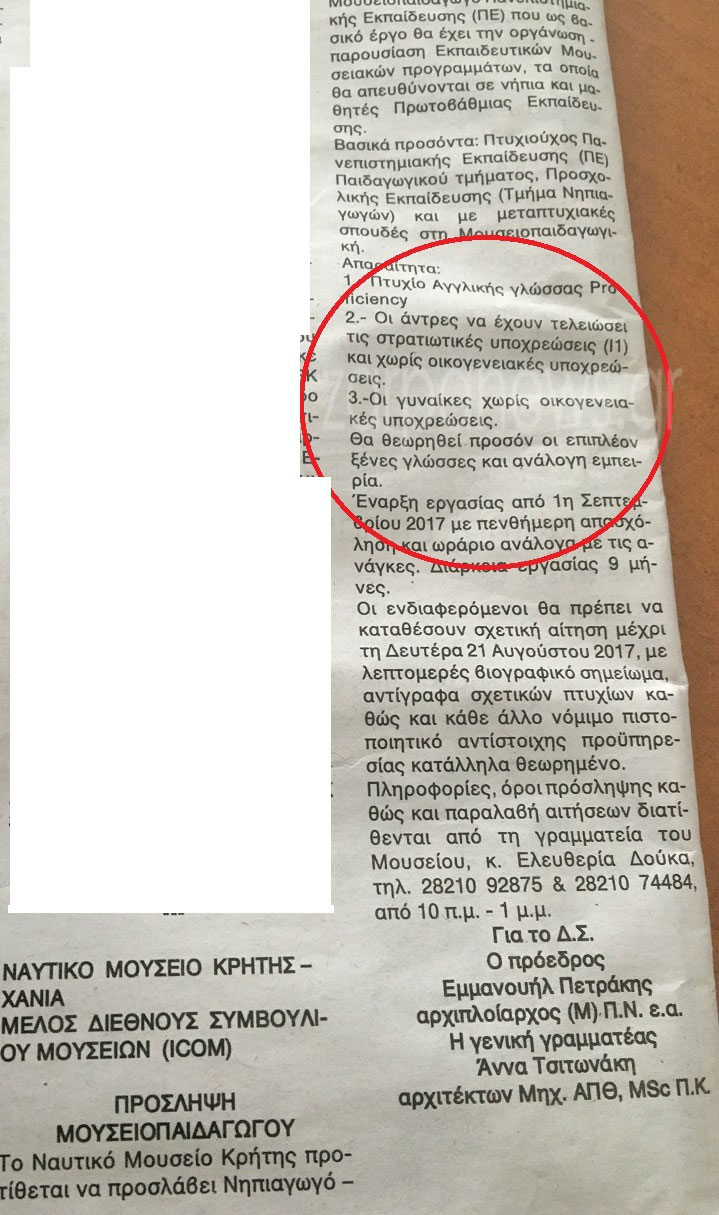 Απίστευτη αγγελία αναζήτησης προσωπικού από το Ναυτικό Μουσείο Κρήτης με έδρα στα Χανιά, που επιθυμεί να προσλάβει Μουσειοπαιδαγωγό, αλλά όπως προκύπτει από την σχετική ανακοίνωση τα πτυχία των ενδιαφερομένων δεν είναι και τα μοναδικά προαπαιτούμενα που θα ληφθούν υπόψη.