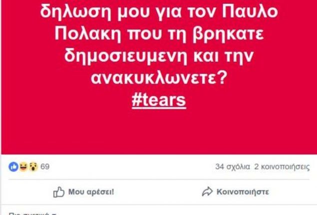 Σε σχόλιο του, κάτω από την ανάρτηση, ξεκαθαρίζει: «Λοιπόν παιδιά πουθενά δεν έχω δώσει συνέντευξη ή τέτοια δήλωση. Αγαπώ Πολάκη, μ’ αρέσει ο τσαμπουκάς του είναι ο μόνος που τολμά».