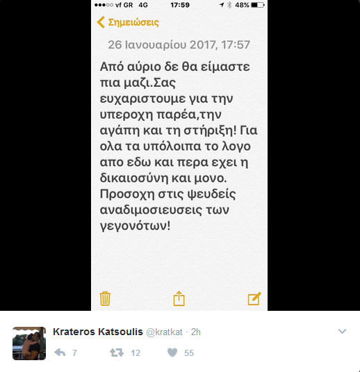 «Από αύριο δεν θα είμαστε πια μαζί. Σας ευχαριστούμε για την υπέροχη παρέα, την αγάπη και την στήριξη! Για όλα τα υπόλοιπα, τον λόγο από δω και πέρα έχει η δικαιοσύνη και μόνο. Προσοχή στις ψευδείς αναδημοσιεύσεις των γεγονότων», έγραψε ο ίδιος.