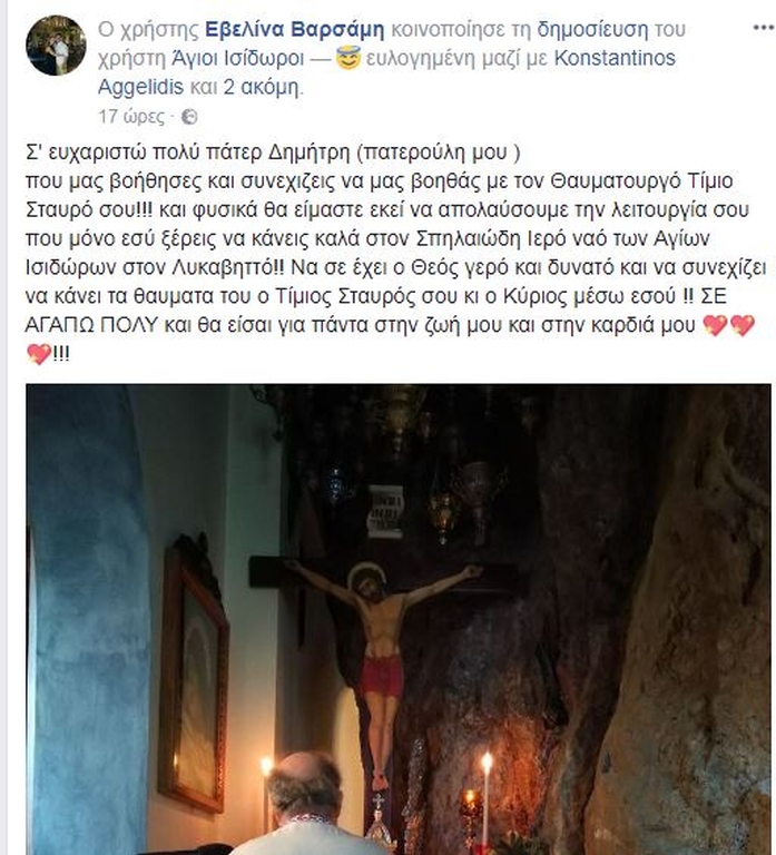 Η ίδια πόσταρε τη φωτογραφία ενός ιερέα στο facebook και έγραψε: «Σ’ ευχαριστώ πολύ πάτερ Δημήτρη (πατερούλη μου ) που μας βοήθησες και συνεχίζεις να μας βοηθάς με τον Θαυματουργό Τίμιο Σταυρό σου!!! και φυσικά θα είμαστε εκεί να απολαύσουμε την λειτουργία σου που μόνο εσύ ξέρεις να κάνεις καλά στον Σπηλαιώδη Ιερό ναό των Αγίων Ισιδώρων στον Λυκαβηττό!!».