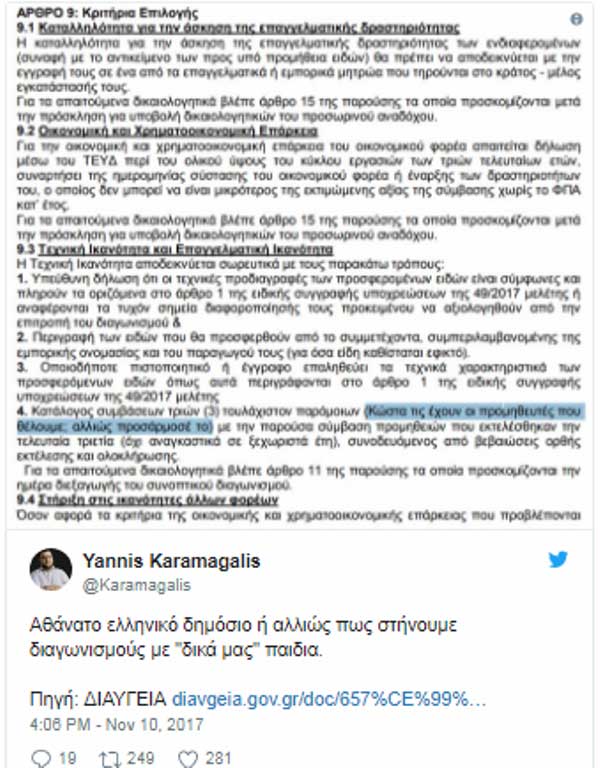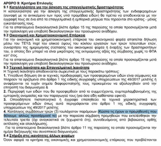 Συγκεκριμένα, ορίζεται ότι οι συμμετέχοντες αποδεικνύουν την τεχνική τους επάρκεια με μια σειρά από όρους μεταξύ των οποίων περιλαμβάνεται και η προσκόμιση καταλόγου «συμβάσεων τριών (3) τουλάχιστον παρόμοιων με την παρούσα σύμβαση προμηθειών…».
