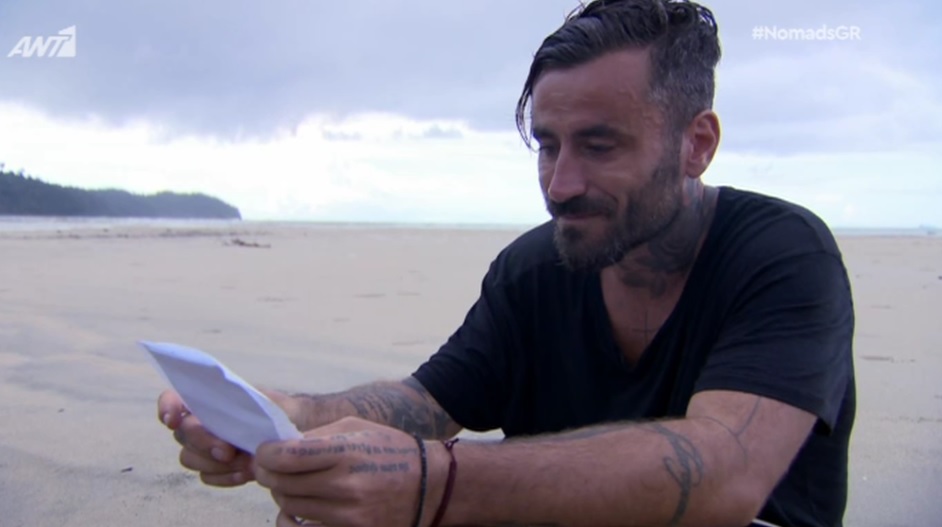 Ιδιαίτερα συγκινητικές στιγμές σήμερα στ NOMADS. Ο Γιώργος Μαυρίδης έλαβε ένα φάκελο από το Γρηγόρη Αρναούτογλου μετά το τέλος του αγωνίσματος για την ασυλία, τον οποίον και κέρδισε η Ομάδα της Φωτιάς.