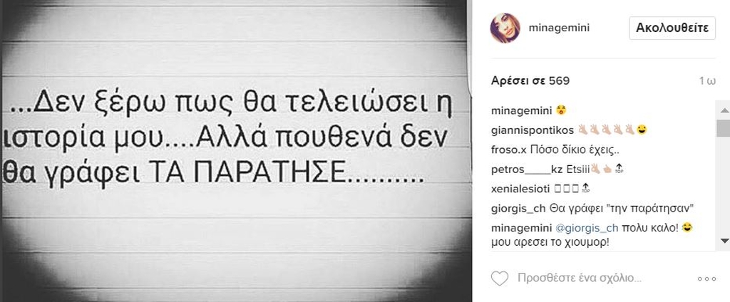 Η Μίνα Αρναούτη ανέβασε μία φωτογραφία στον προσωπικό της λογαριασμό στο Instagram, η οποία έγραφε χαρακτηριστικά: