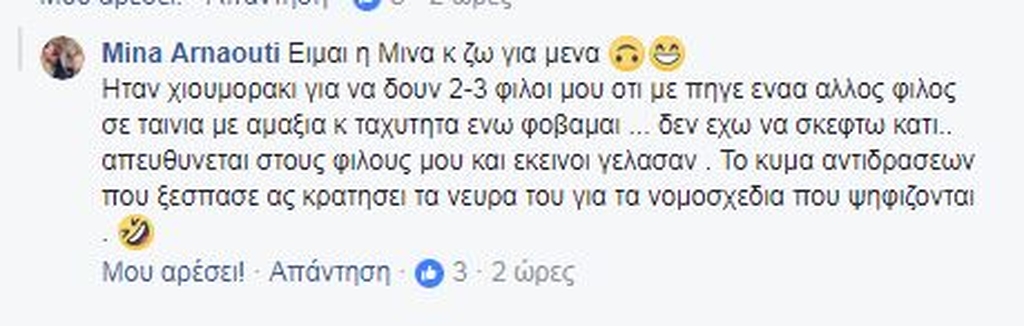 Στη συνέχεια δε φρόντισε να σχολιάσει: «Είμαι η Μίνα και ζω για μένα. Ήταν χιουμοράκι για να δουν 2-3 φίλοι μου ότι με πήγε ένας άλλος φίλος σε ταινία με αμάξια και ταχύτητα ενώ φοβάμαι … δεν έχω να σκεφτώ κάτι.. απευθύνεται στους φίλους μου και εκείνοι γέλασαν . Το κύμα αντιδράσεων που ξέσπασε ας κρατήσει τα νεύρα του για τα νομοσχέδια που ψηφίζονται».
