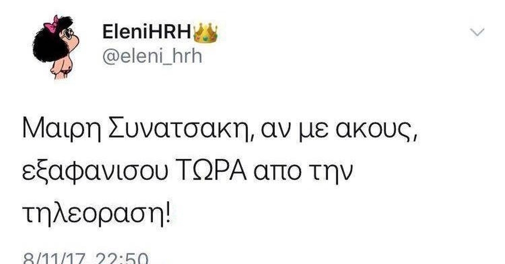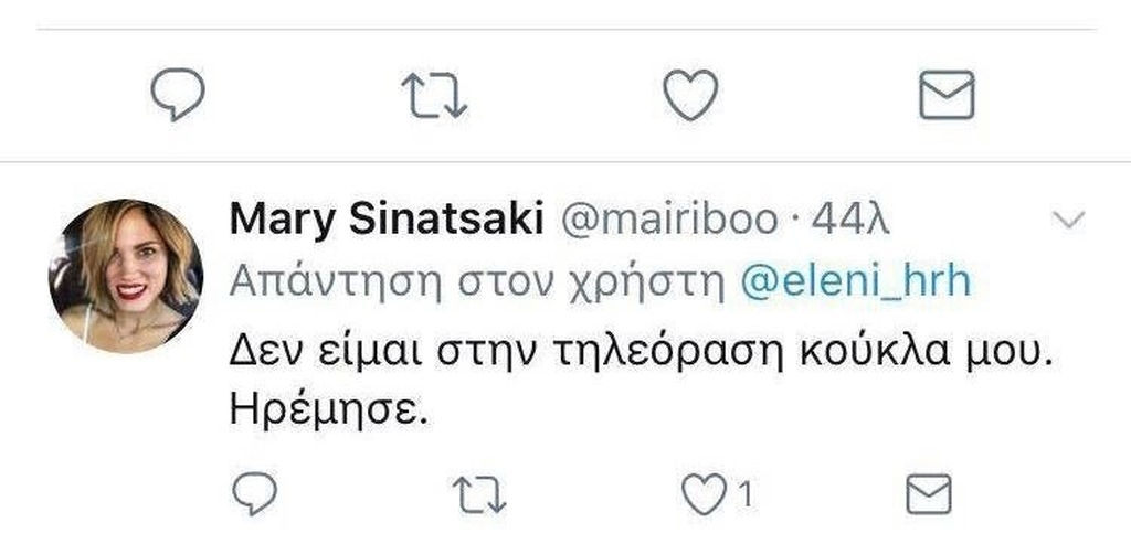 Μία χρήστης του Twitter προχώρησε σε μία απρόκλητη επίθεση εναντίον της, γράφοντας δημόσια «Μαίρη Συνατσάκη, αν με ακούς, εξαφανίσου ΤΩΡΑ από την τηλεόραση» στο Twitter και η απάντηση από την παρουσιάστρια ήταν άμεση και αποστομωτική: «δεν είμαι στην τηλεόραση κούκλα μου. Ηρέμησε».
