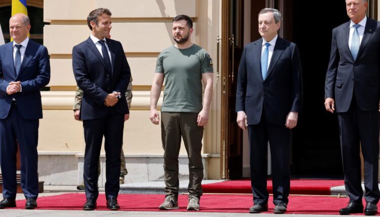 Μία μέρα πριν η Ευρωπαϊκή Επιτροπή ανακοινώσει τη σύστασή της σχετικά με το καθεστώς της Ουκρανίας ως υποψήφιας χώρας για ένταξη στην Ευρωπαϊκή Ένωση, Μακρόν, Σολτς και Ντράγκι έφτασαν με τρένο στο Κίεβο και σε δηλώσεις τους υποστήριξαν την «άμεση» ένταξη της χώρας στην ΕΕ.