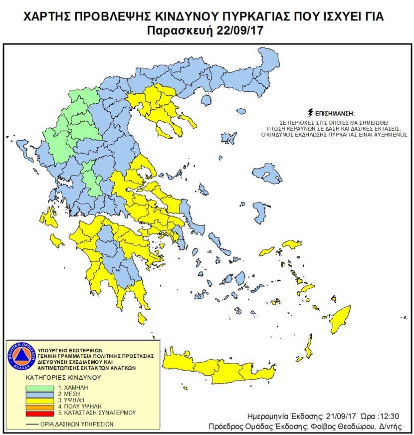Σύμφωνα με το Χάρτη Πρόβλεψης Κινδύνου Πυρκαγιάς που εκδίδει η Γενική Γραμματεία Πολιτικής Προστασίας του Υπουργείου Εσωτερικών και Διοικητικής Ανασυγκρότησης, για σήμερα Παρασκευή, 22 Σεπτεμβρίου, προβλέπεται υψηλός κίνδυνος πυρκαγιάς (κατηγορία κινδύνου 3) σε αρκετές περιοχές της Ελλάδας.