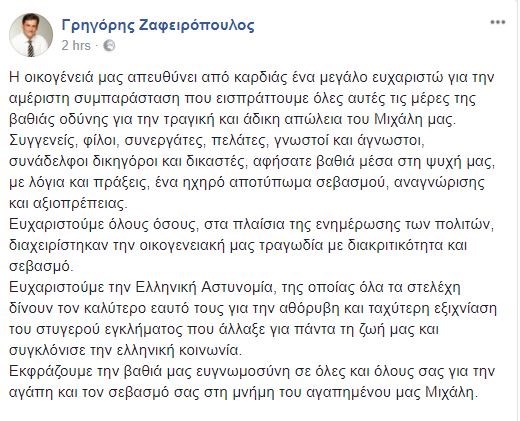 Με ανάρτηση στον λογαριασμό του στο Facebook, ο αδελφός του Μιχάλη Ζαφερόπουλου, πρώην Δήμαρχος Χαλανδρίου, Γρηγόρης Ζαφειρόπουλος, λέει, εκ μέρους της οικογένειας, ένα μεγάλο “ευχαριστώ” για τη συμπαράσταση που εισπράττει μετά την τραγική απώλεια του γνωστού δικηγόρου.