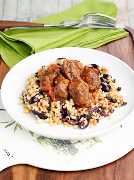 Οι ελιές ταιριάζουν πολύ με το μοσχαράκι, ενώ το πλιγούρι είναι ένα πολύ γευστικό και χορταστικό συνοδευτικό, που δένει αρμονικά με το κοκκινιστό.