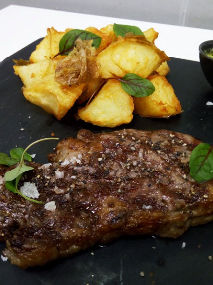 Ζουμερές μοσχαρίσιες μπριζόλες που συνοδεύουμε με πατάτες τρυφερές εσωτερικά, τραγανές εξωτερικά και ταιριάζουμε με αργεντίνικη σάλτσα τσιμιτσούρι.