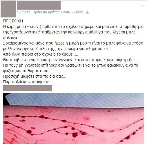 Η κόρη μου (9 ετών) ήρθε από το σχολείο σήμερα και μου είπε, συμμαθήτρια της «γρατζουνίστηκε» παίζοντας την καινούργια μάστιγα που λέγεται “μπλε φάλαινα”.