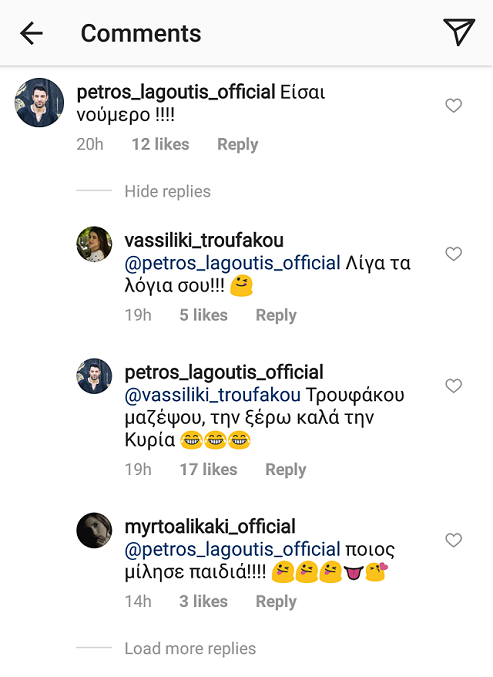 Ο Πέτρος έγραψε: «Τρουφάκου μαζέψου, την ξέρω καλά την Κυρία», ενώ η Μυρτώ Αλικάκη απάντησε πειράζοντάς τον: «Ποιος μίλησε παιδιά!!!»