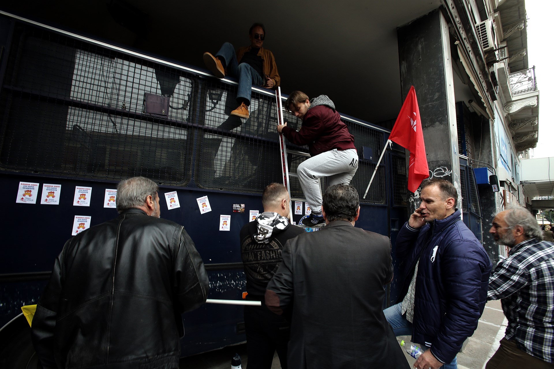 Μέλη του «Κινήματος δεν πληρώνω» και της Λαϊκής Ενότητας ύψωσαν πανό και φώναξαν συνθήματα πως «αντιστέκονται στη λαίλαπα των ηλεκτρονικών πλειστηριασμών», ενώ στην είσοδο του συμβολαιογραφείου ήταν κλούβα των ΜΑΤ.