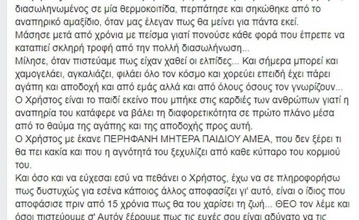 Σοκαρισμένη είναι η Νένα Χρονοπούλου καθώς κάποιος άγνωστος της έστειλε ένα μήνυμα με φριχτά λόγια για τον γιο της Χρήστο.Ένας χρήστης του Facebook, του οποίου η ταυτότητα είναι υπαρκτή στο χυδαίο μήνυμα προς στη Νένα Χρονοπούλου ευχόταν να πεθάνει ο γιος της Χρήστος, που είναι ένα παιδί με ειδικές ανάγκες.