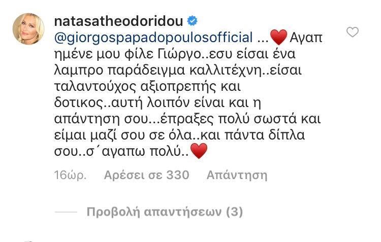 Θέση πήρε και η Νατάσα Θεοδωρίδου που διατηρεί μια φιλική σχέση με τον Γιώργο Παπαδόπουλο, σπεύδοντας να σχολιάσει το γεγονός στην διαδικτυακή πλατφόρμα. Συγκεκριμένα, έγραψε το εξής σχόλιο στο Instagram-post της ανακοίνωσης που έκανε ο Γιώργος Παπαδόπουλος: