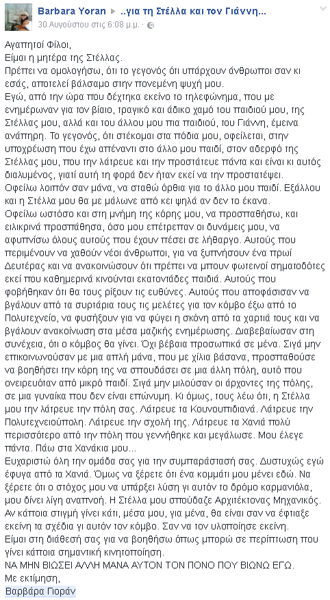 Στο πλαίσιο αυτής της κινητοποίησης η μητέρα της Στέλλας βρίσκει το κουράγιο να γράψει και να τους ευχαριστήσει για όλες τις ενέργειες ενώ τα λόγια της αποτελούν και “χαστούκι” για όλους όσους δεν έχουν κάνει τίποτα όλα αυτά τα χρόνια από τη θέση των υπευθύνων.