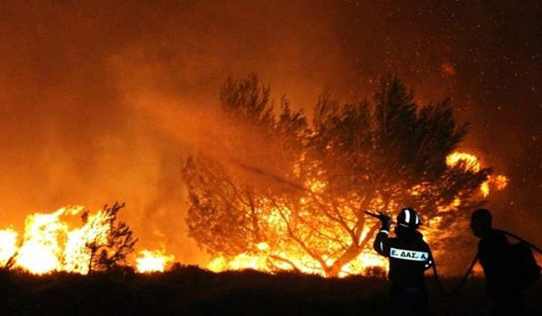 Όλες οι διαθέσιμες επίγειες πυροσβεστικές δυνάμεις δίνουν μάχη με το πύρινο μέτωπο που καίει το δάσος και απειλεί το χωρό.