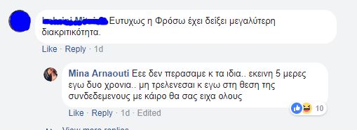 Οι διαδικτυακοί της φίλοι έσπευσαν να σχολιάσουν το στιγμιότυπο και μεταξύ άλλων δέχτηκε το σχόλιο πως η Φρόσω Κυριακού είναι περισσότερο διακριτική. Η Μίνα πήρε θέση και της απάντησε: «Εεε δεν περάσαμε και τα ίδια. Εκείνη 5 μέρες εγώ δυο χρόνια… Μην τρελαίνεσαι κι εγώ στη θέση της συνδεδεμένους με Κάιρο θα σας είχα όλους».