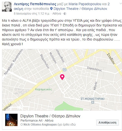 Ο γνωστός στιχουργός έγραψε χαρακτηριστικά: «Μα τι κάνει ο ALPHA, βάζει τραγούδια μου «Στην υγειά μας» και δεν γράφει όπως έκανε παλιά , ότι είναι δικά μου; Γιατί; Επειδή οι δημιουργοί δεν πρόκειται να πάρουν φράγκο; Αν είναι έτσι θα τ’ αποσύρω. Και για εσάς παιδιά, που κάνετε αυτό το επάγγελμα που εκτός από κατάθεση ψυχή , ως τώρα ήταν αυτονόητο πως ο δημιουργός πρέπει και να τρώει, το ίδιο συμβουλεύω …… Καλή χρονιά!»