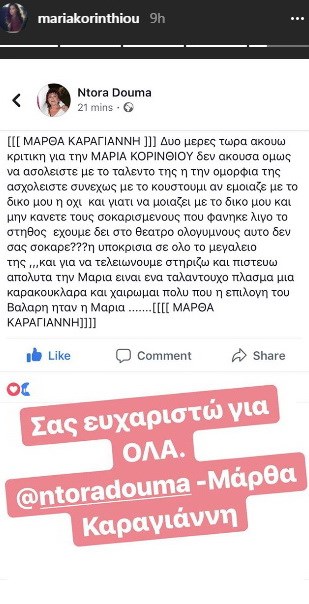 [[[ ΜΑΡΘΑ ΚΑΡΑΓΙΑΝΝΗ]]] Δυο μέρες τώρα ακούω κριτική για την Μαρία Κορινθίου. Δεν άκουσα όμως να ασχολείστε με το ταλέντο της ή την ομορφιά της. Ασχολείστε συνεχώς με το κουστούμι. Αν έμοιαζε με το δικό μου η όχι. Και γιατί να μοιάζει με το δικό μου; Και μην κάνετε τους σοκαρισμένους που φάνηκε λίγο το στήθος έχουμε δει στο θέατρο ολόγυμνους αυτό δεν σας σόκαρε??? Η υποκρισία σε όλο το μεγαλείο της. Και για να τελειώνουμε στηρίζω και πιστεύω απόλυτα την Μαρία. Είναι ένα ταλαντούχο πλάσμα μια καρακουκλαρα και χαίρομαι πολύ που η επιλογή του Βάλαρη ήταν η Μαρία …….[[[[ ΜΑΡΘΑ ΚΑΡΑΓΙΑΝΝΗ]]]]», έγραφε.