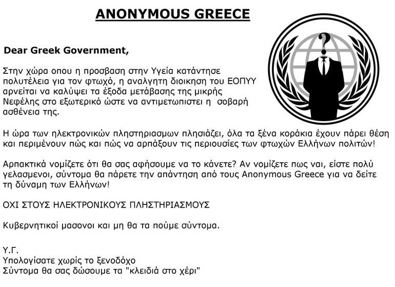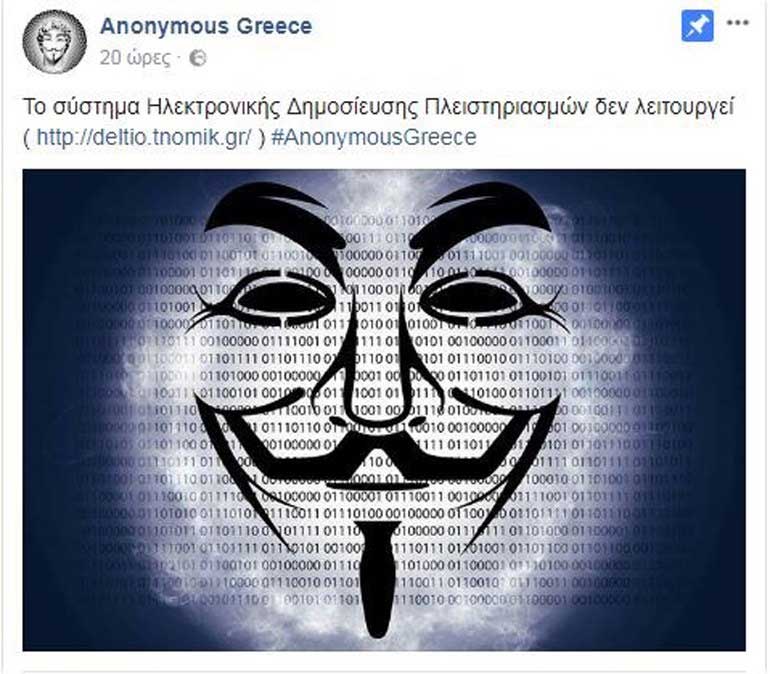 Σύμφωνα με ανάρτηση της ομάδας «Anonymous Greece» στη σελίδα της στο Facebook, η ομάδα των άγνωστων χάκερς είναι αυτοί που στις 11 το πρωί του Σαββάτου «έριξαν» τη σελίδα. Σε μήνυμά τους επικρίνουν την κυβέρνηση για τους πλειστηριασμούς και απειλούν ευθέως την Τράπεζα της Ελλάδος.