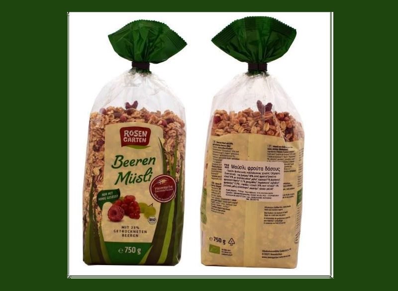 Πρόκειται για το προϊόν με την εμπορική ονομασία «ΜΟΥΣΛΙ ΦΡΟΥΤΑ ΤΟΥ ΔΑΣΟΥΣ ΒΙΟ (Beeren Müsli)», σε συσκευασία των 750 g ανά τεμάχιο, με ανάλωση κατά προτίμηση πριν από 28.05.2018, το οποίο παρασκευάστηκε από τη Γερμανική εταιρεία “Rosengarten Minderleinsmühle GmbH & Co. KG” και διακινήθηκε στην Ελλάδα, από την επιχείρηση «ΒΙΟ-ΥΓΕΙΑ Ε.Π.Ε.» (Αργυρουπόλεως 5, Άγιος Στέφανος).