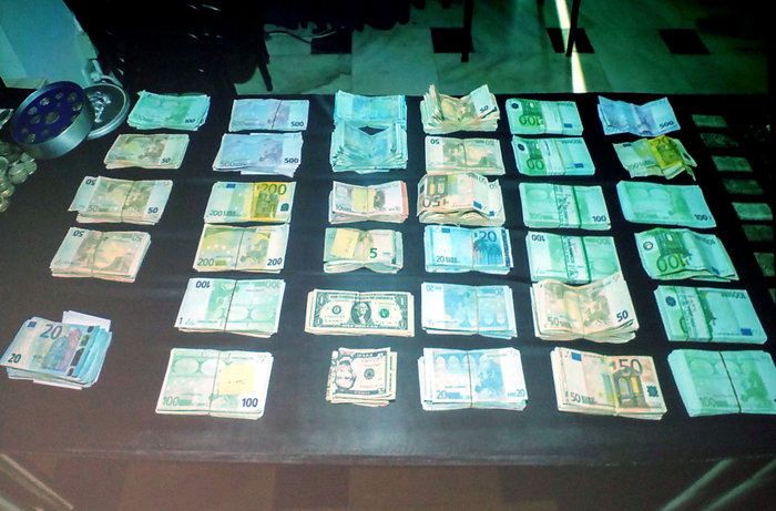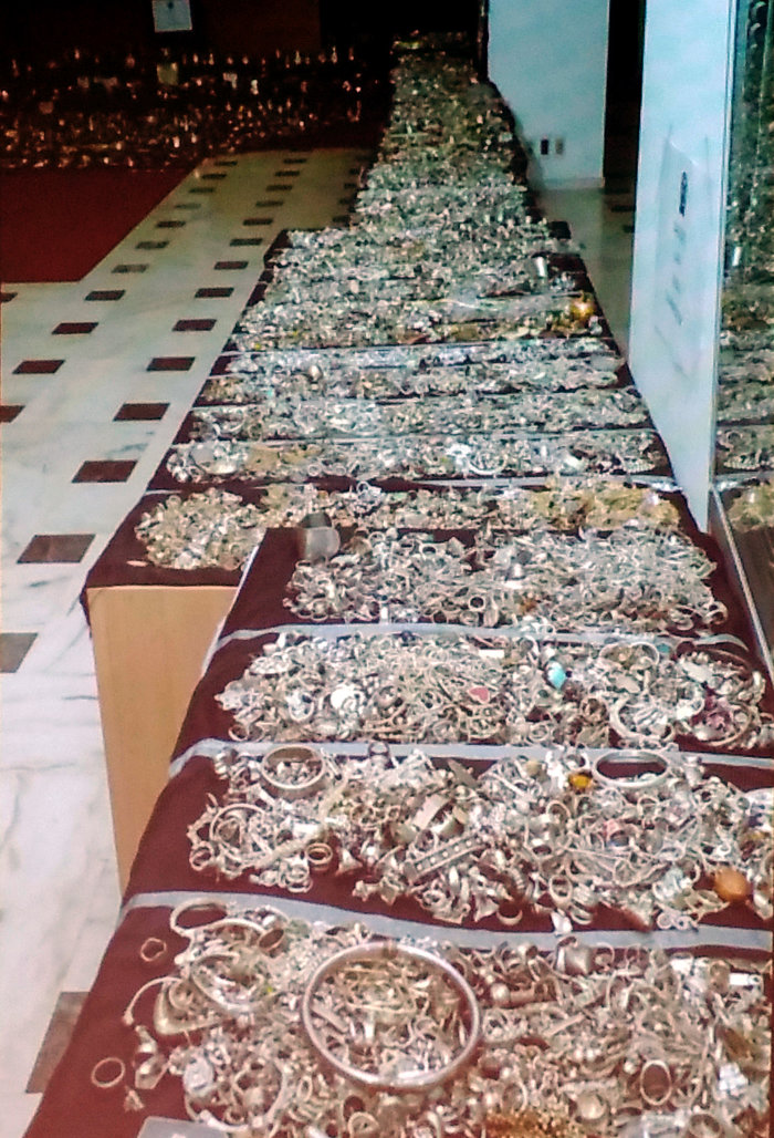 Μέσα σε ψυγεία, φούρνους, σε καλάθια ρούχων, σιφώνια, υδροροές, κρύπτες στους τοίχους και σε συσκευές, βρέθηκαν πάνω από 700 κιλά χρυσαφικών, ασημικών και κοσμημάτων (ρολόγια, δακτυλίδια, σταυροί), 100.000 ευρώ σε μετρητά καθώς και ποσότητα διαμαντιών μεγάλης αξίας.