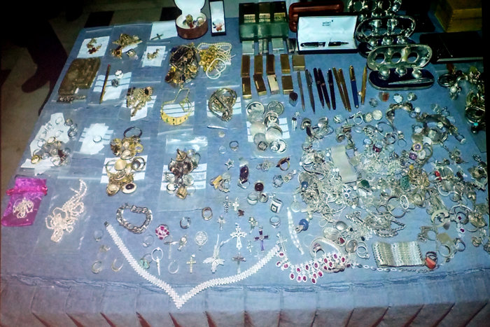 «Από την προηγούμενη Παρασκευή -23 Ιούνιου 2017- βρίσκονται στα χέρια της Ελληνικής Αστυνομίας πάνω από επτακόσια κιλά χρυσαφικά και κοσμήματα καθώς και άλλα τιμαλφή και κειμήλια, όπως πολύτιμοι λίθοι, συλλεκτικά νομίσματα, θρησκευτικές εικόνες και άλλα αντικείμενα, τα οποία ξεπερνούν σε αξία τα 10.000.000 ευρώ και προέρχονται από τη δράση του γνωστού εγκληματικού δικτύου στον τομέα των ληστειών και διαρρήξεων, που εξάρθρωσε η Διεύθυνση Ασφάλειας Αττικής.