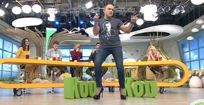 Έτσι, ο Κρατερός απάντησε στο «Προκαλώ» του Νίκου Μουτσινά και κατέληξε να βγει με 15ποντες γόβες στον αέρα του «Στην φωλιά των Κου Κου». Όχι απλά όμως εμφανίστηκε, αλλά κατέληξε και να χορέψει στο πλατό.