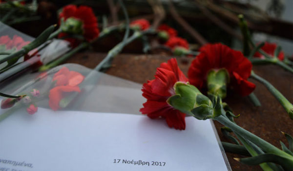 Η ιστορική προσωπικότητα της Αριστεράς και γενικότερα της Ελλάδας, συνοδευόμενος από έναν νεαρό που κρατούσε μια ομπρέλα και κρατώντας δύο κόκκινα τριαντάφυλλα στο χέρι, κατευθύνθηκε προς τον το μνημείο, άφησε τα λουλούδια και -χωρίς την προστασία της ομπρέλας- σήκωσε τη γροθιά του.