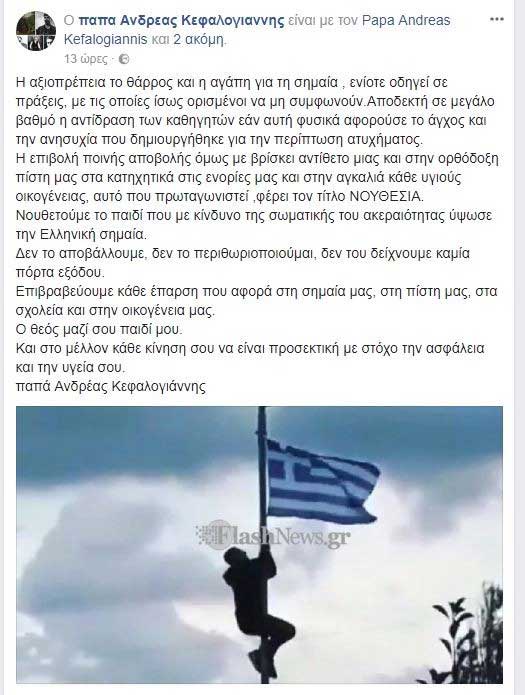 Με την γλώσσα της λογικής, ο παπα – Ανδρέας Κεφαλογιάννης, σχολιάζει σε ανάρτησή του σε μέσο κοινωνικής δικτύωσης το περιστατικό που συνέβη σε σχολείο του Ηρακλείου και το οποίο αποκάλυψε το Flashnews.gr, με την αποβολή μαθητή που ανέβηκε σε κολώνα φωτισμού για να αναρτήσει την ελληνική σημαία παραμονή της 28ης Οκτωβρίου, επειδή στο σχολείο δεν υπήρχε σημαία.