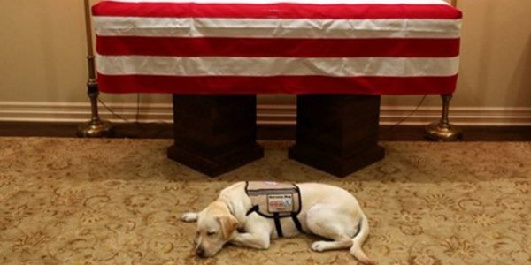Η Σάλι, το λαμπραντόρ του Τζορτζ Μπους του πρεσβύτερου στέκει άγρυπνος φρουρός δίπλα από το φέρετρό του που είναι καλυμμένο με την αστερόεσσα. Ο Τζιμ ΜακΓκραθ, που ήταν για χρόνια εκπρόσωπος του εκλειπόντος ανέβασε στο Twitter δύο φωτογραφίες λέγοντας πως «αποστολή εξετέλεσθη».